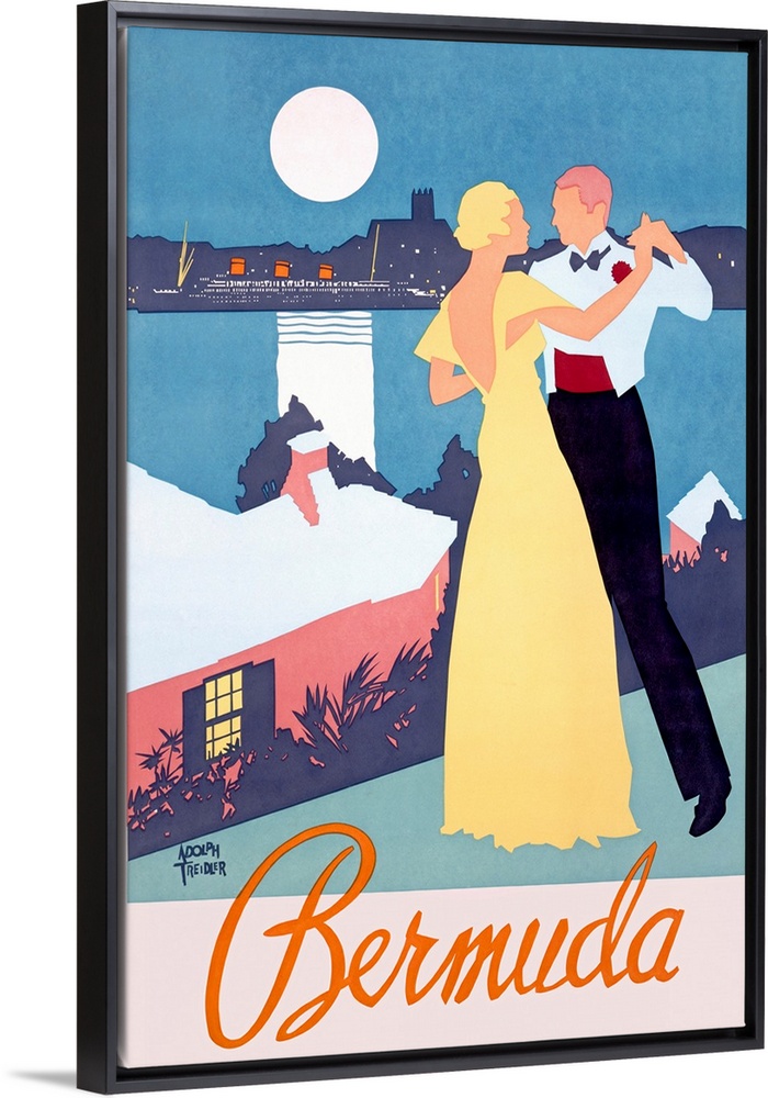 <p>Vintage travel poster for the island of Bermuda with an elegant couple dancing on the shores and a cruise ship docked in port.</p>