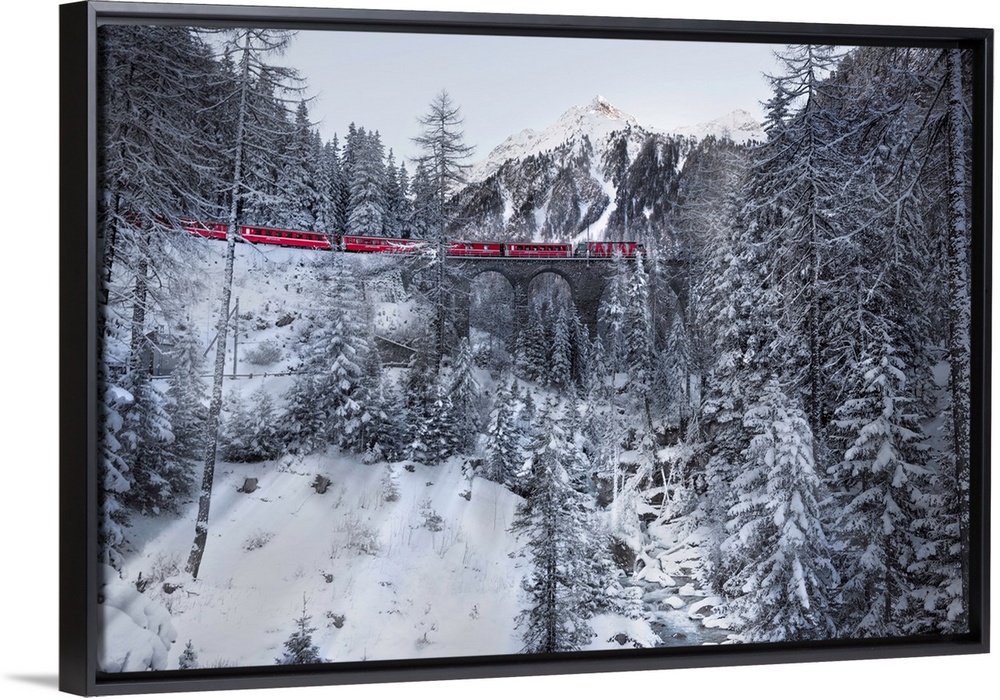 <p>Photograph of a red train passing through a snowy mountainous valley in winter along an arched railroad.</p>
