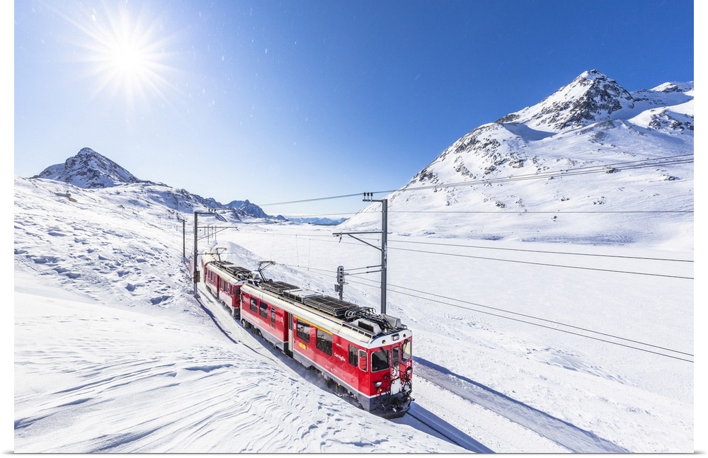 <p>Bernina Express transit along Lago Bianco in winter, Bernina Pass, Engadine, Canton of Graubunden, Switzerland, Europe</p>