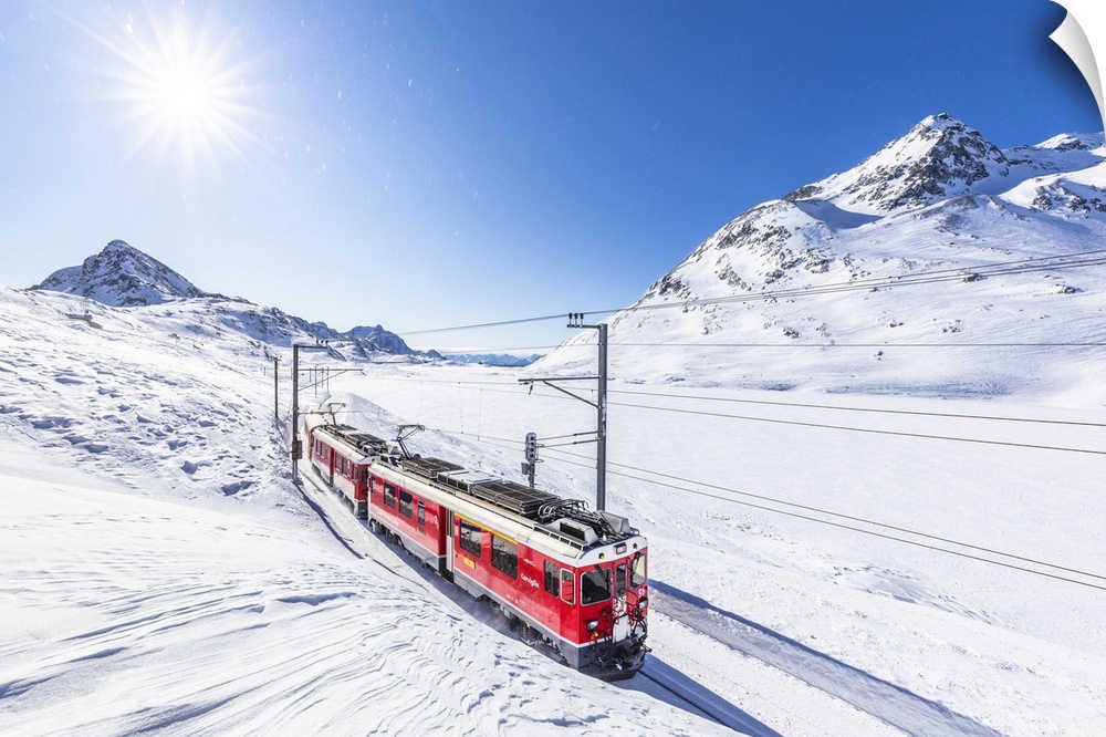 <p>Bernina Express transit along Lago Bianco in winter, Bernina Pass, Engadine, Canton of Graubunden, Switzerland, Europe</p>