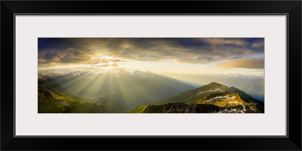<p>Aerial panoramic of Bernina mountain range and Pizzo Scalino lit by sunrise, Valmalenco, Valtellina, Lombardy, Italy, Europe</p>
