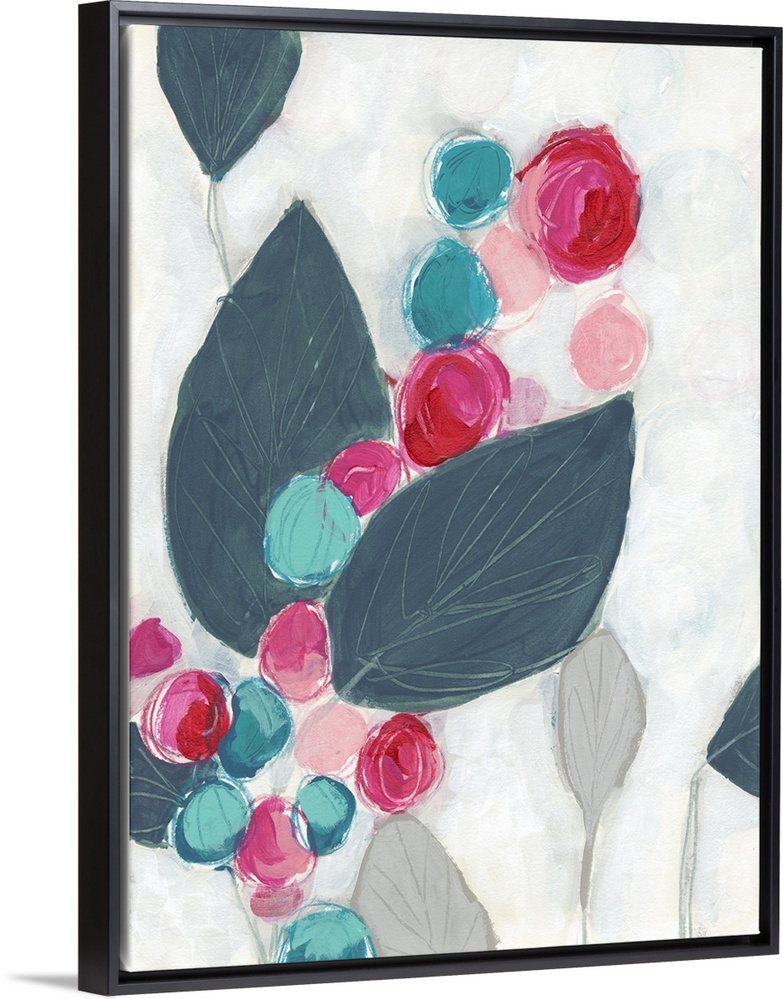 <p>Floral abstract painting in bright pink and teal on a light gray background.</p>