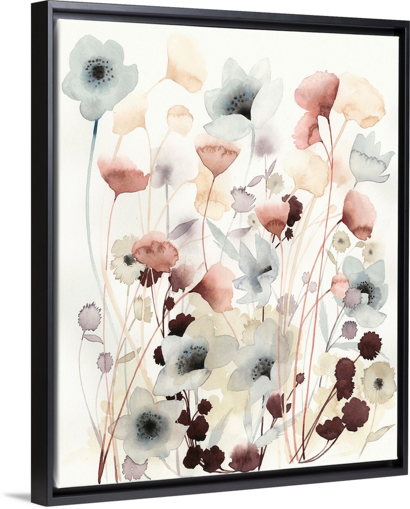 <p>Watercolor painting of a flower bed with pastel wildflowers.</p>
