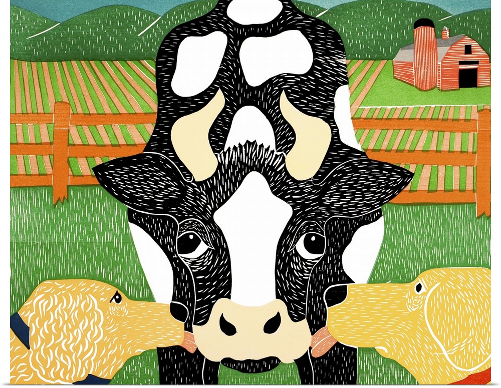 <p>Illustration of a golden retriever and a yellow lab licking a cow with a farm and red barn in the background.</p>
