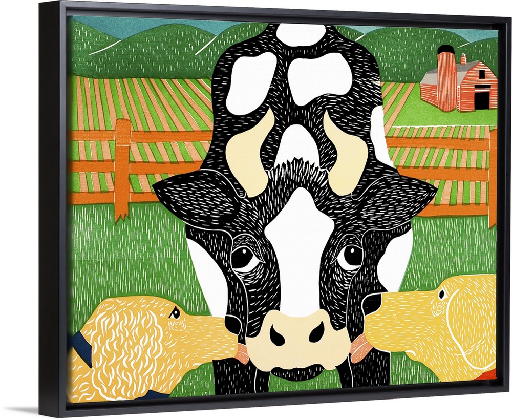 <p>Illustration of a golden retriever and a yellow lab licking a cow with a farm and red barn in the background.</p>
