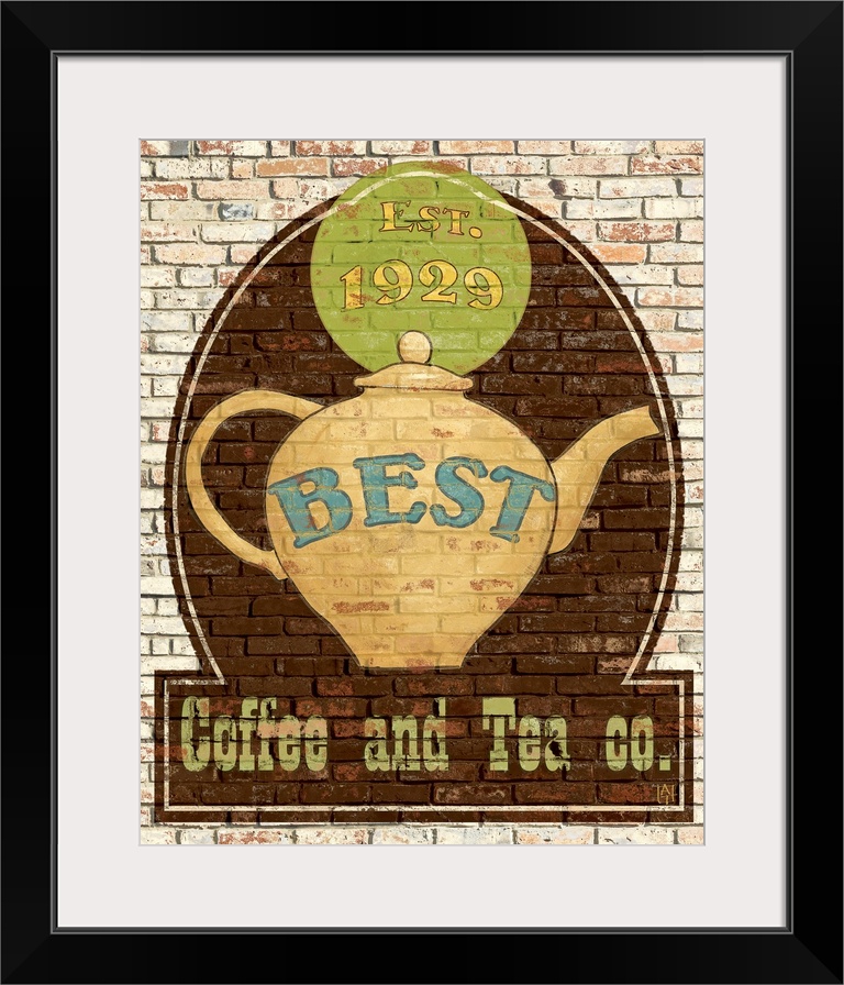 <p>Big canvas print of a a logo for tea and coffee painted onto a brick wall.</p>