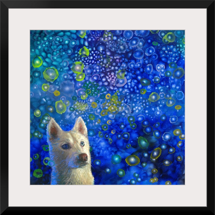 <p>Brightly colored contemporary artwork of a white dog with blue background.</p>