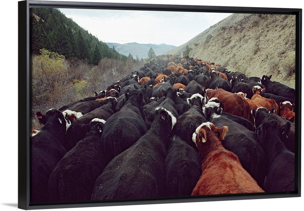 <p>Cattle travel from the Continental Divide, where the herd grazed all summer, to the Lemhi Valley, where it will feed on hay until the following spring.</p>