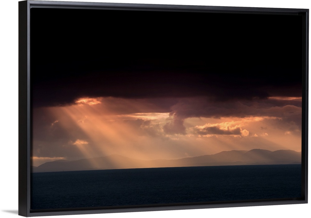 <p>Fine art photo of beams of light coming from dark clouds over a lake.</p>