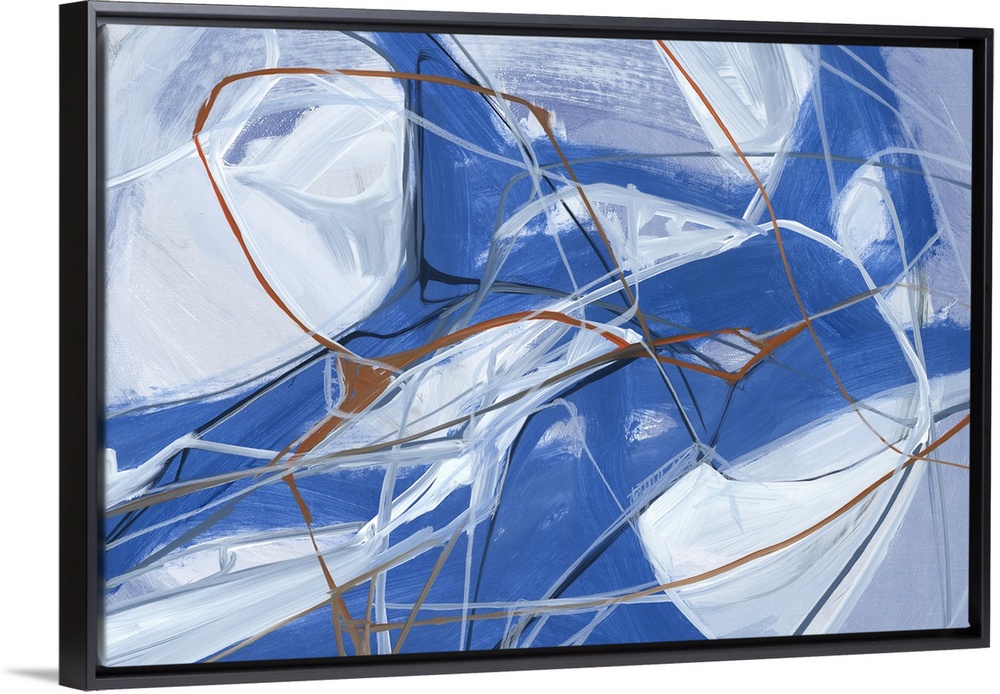 <p>A contemporary abstract painting of various blue tones in bold movements making interlocking webs.</p>