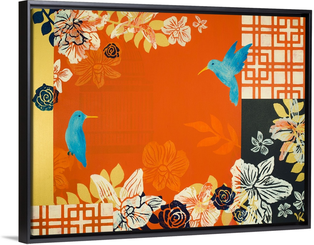 <p>Painting of two bluebirds a garden of orchids with orange background and screens.</p>
