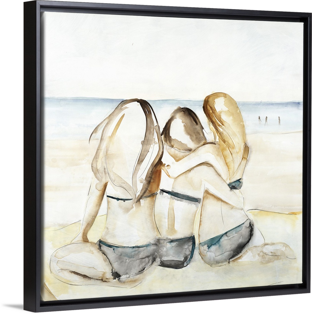 <p>Square watercolor painting of three girls in bikinis sitting next to each other on the beach looking towards the ocean.</p>