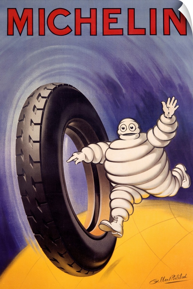 <p>Michelin man running with tire against blue background.</p>