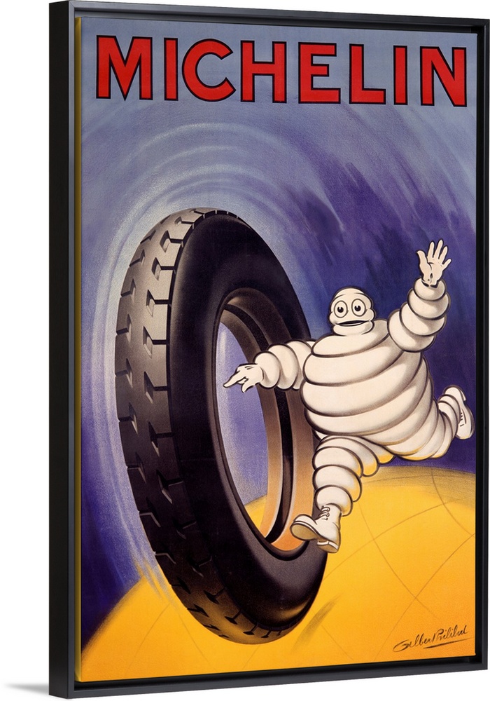 <p>Michelin man running with tire against blue background.</p>