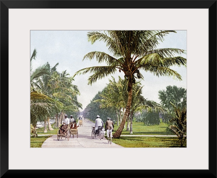 <p>Vintage photograph taken as people bicycle down a walking path that is lined with short palm trees.</p>