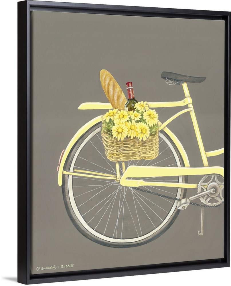 <p>Painting of the rear of a pale yellow beach cruiser with a basket full of yellow flowers, french bread, and a bottle of wine, on a gray background.</p>