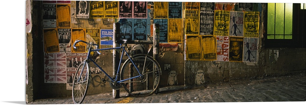 <p>This panoramic photograph is a cobblestoned street build on a slant and a wall covered in band posters with a bike chained to it.</p>