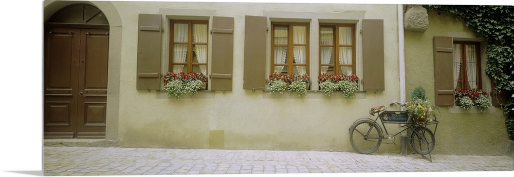 <p>Panoramic photograph of home with huge wooden arched door, windows, shutters, and flowerboxes.</p>