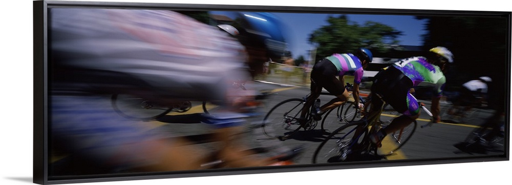 <p>Panoramic blur motion photograph of cyclists racing on the street.</p>
