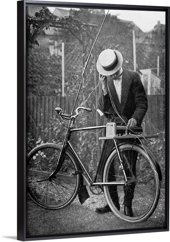 <p>Bicycle radio antenna. The bike is being used to support an improvised radio antenna to enable reception of radio signals being listened to by the operator. Radio technology was developed in the 1890s, with the range of broadcasts increasing as the technology and antenna designs improved. Photograph published in 'La Telegraphie Sans Fil' (Wireless Telegraphy, 1914), by the French geophysicist Alphonse Berget (1860-1934).</p>