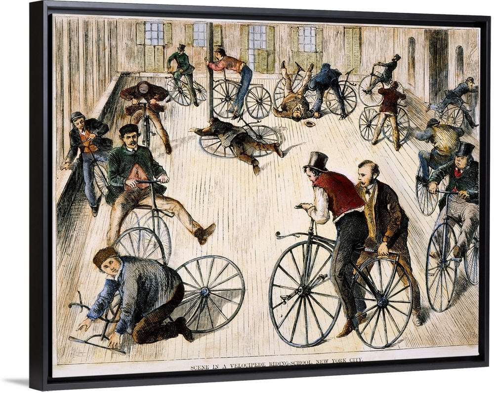 <p>In New York City at the time of the first American bicycle craze: line engraving from a contemporary American newspaper.</p>