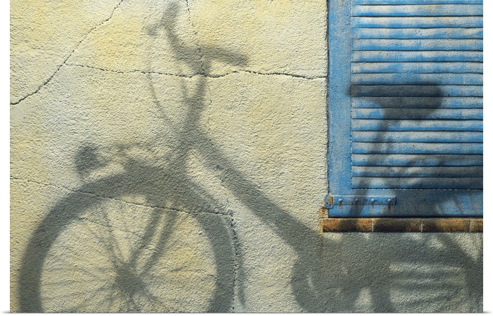 <p>Photograph of the shadow of a bicycle on a wall and blue shutters.</p>
