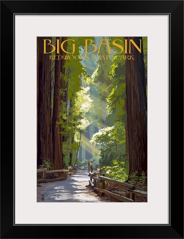 <p>Retro stylized art poster of a pathway through giant redwood trees.</p>