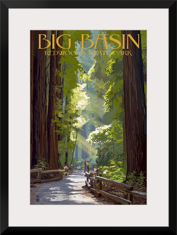 <p>Retro stylized art poster of a pathway through giant redwood trees.</p>