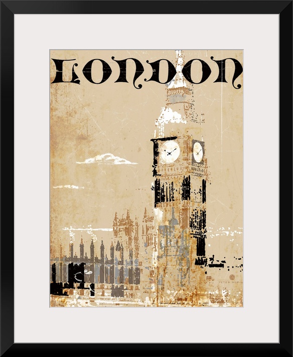 <p>Big Ben in London during the day with the hustle and bustle of the city depicted in the rust background with the typography London placed at the top.</p>