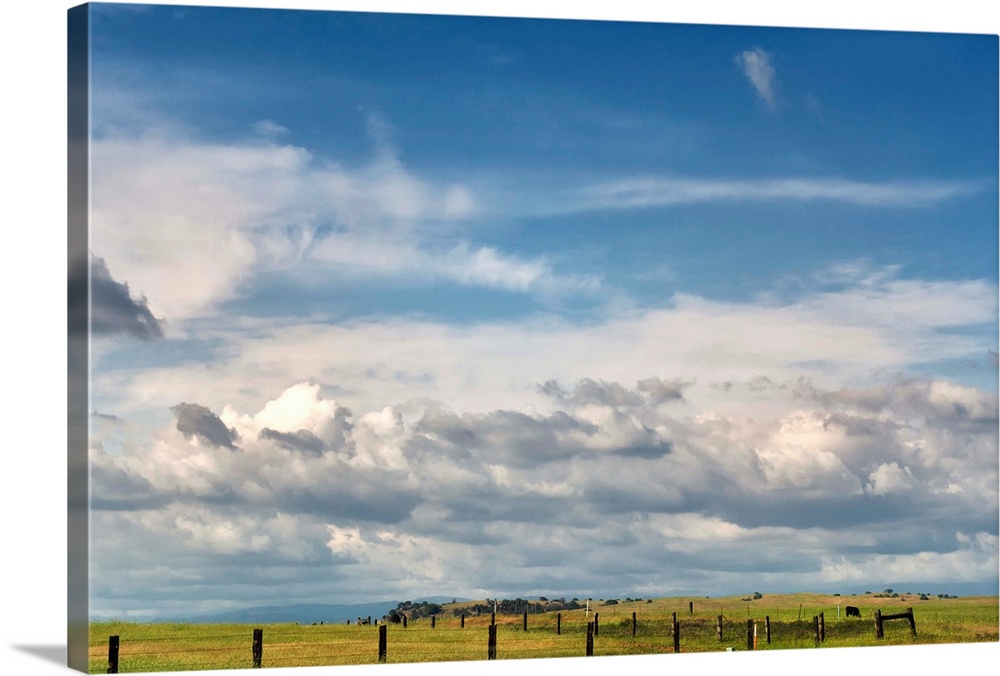 <p>Big blue sky with cumulus clouds fills most of image with slim view of grassland and fences of western ranch on lower quarter of frame.</p>