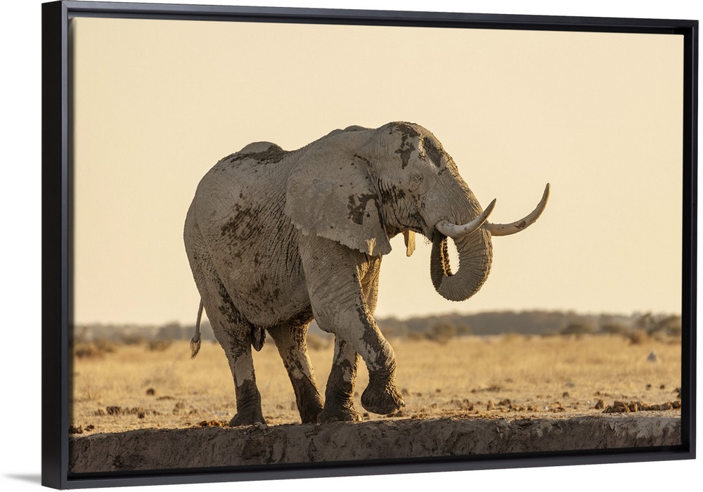 <p>Big bull elephant drinking at a waterhole, Nxai Pan National Park, Botswana.</p>