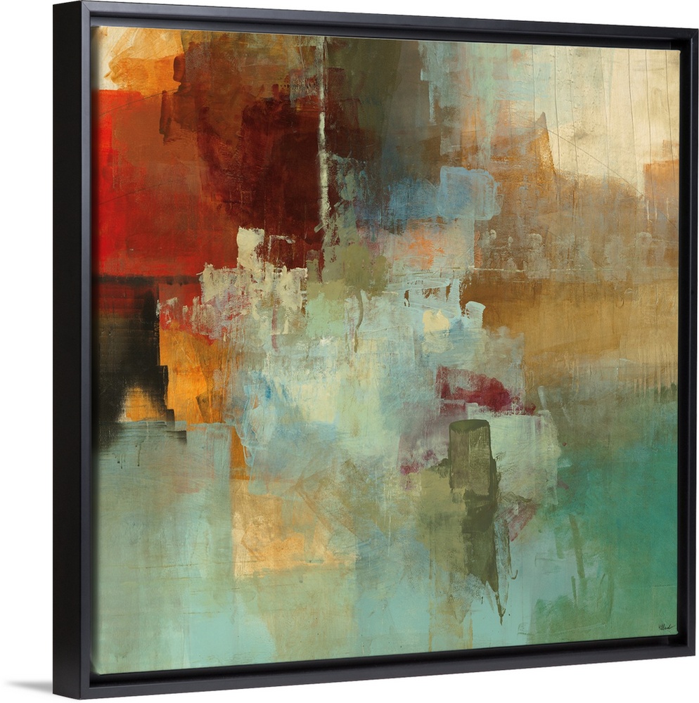<p>Large, square contemporary painting in a variety of warm and cool colors of patchy, square and rectangular shapes, with sponge like brush strokes.</p>
