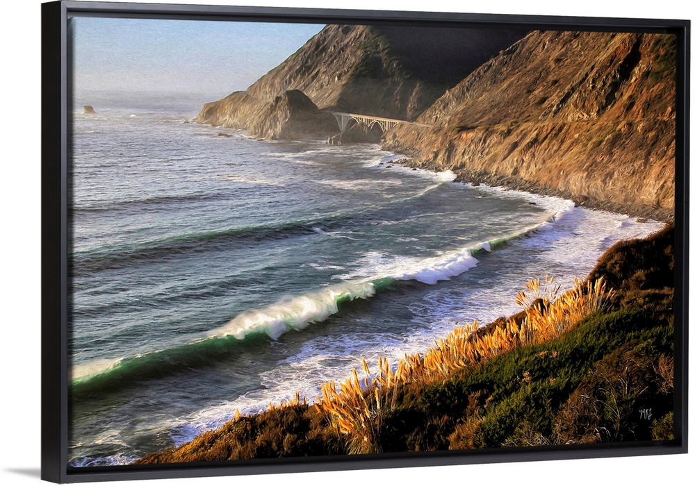 <p>Located in the southern part of Big Sur, the Big Creek Bridge is a beautiful structure that boasts two concrete arches and supports 589 feet of Highway 1. A breaking wave and pampas grass in the foreground glow in the light of the setting sun. The water's shades of blue, green and violet add a calm and soothing effect. To the right of the bridge, you can make out Highway 1 ascending the rocky coast.</p>