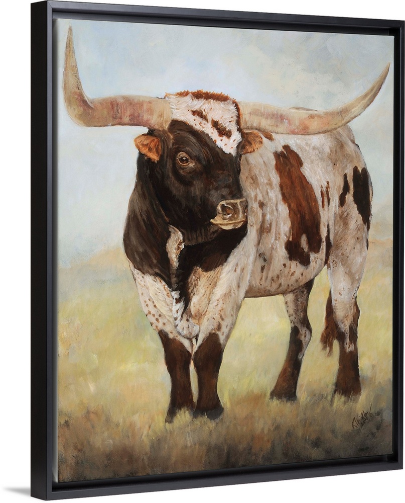 <p>Horizontal contemporary artwork of a longhorn cow grazing on a field in cool tones.</p>