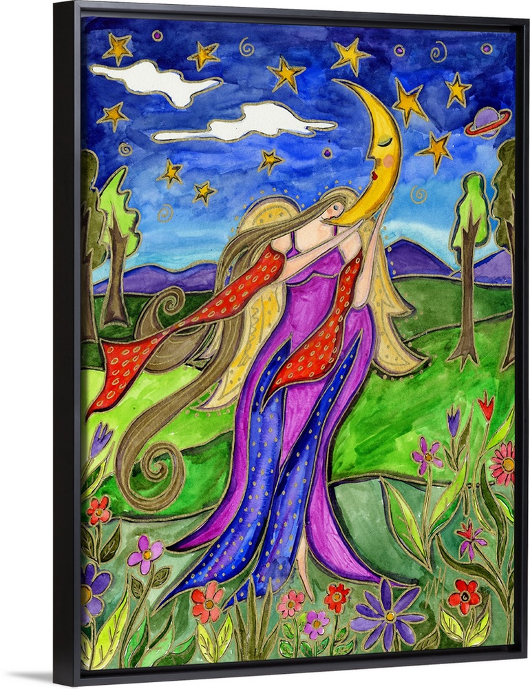 <p>An angel in a flowing dress holding a crescent moon in a garden under a starry sky.</p>