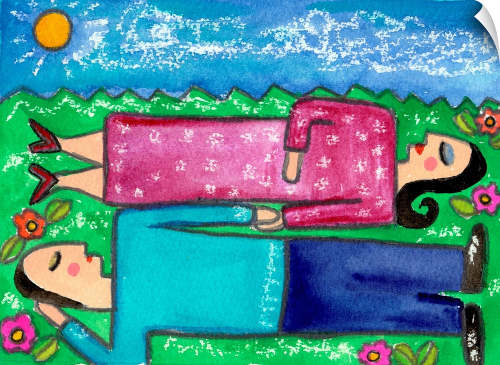 <p>A couple laying in the grass and holding hands, under a blue sky.</p>
