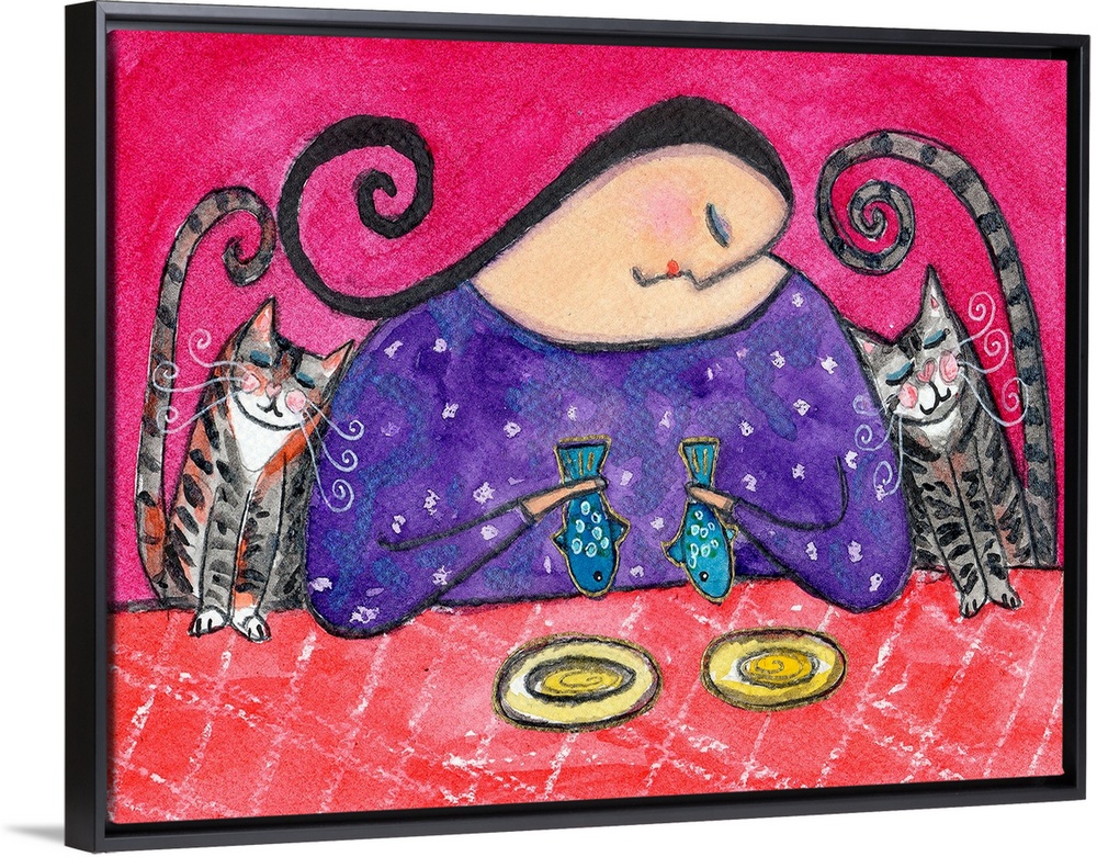 <p>A woman in purple holding two fish with two grey tabby cats next to her.</p>