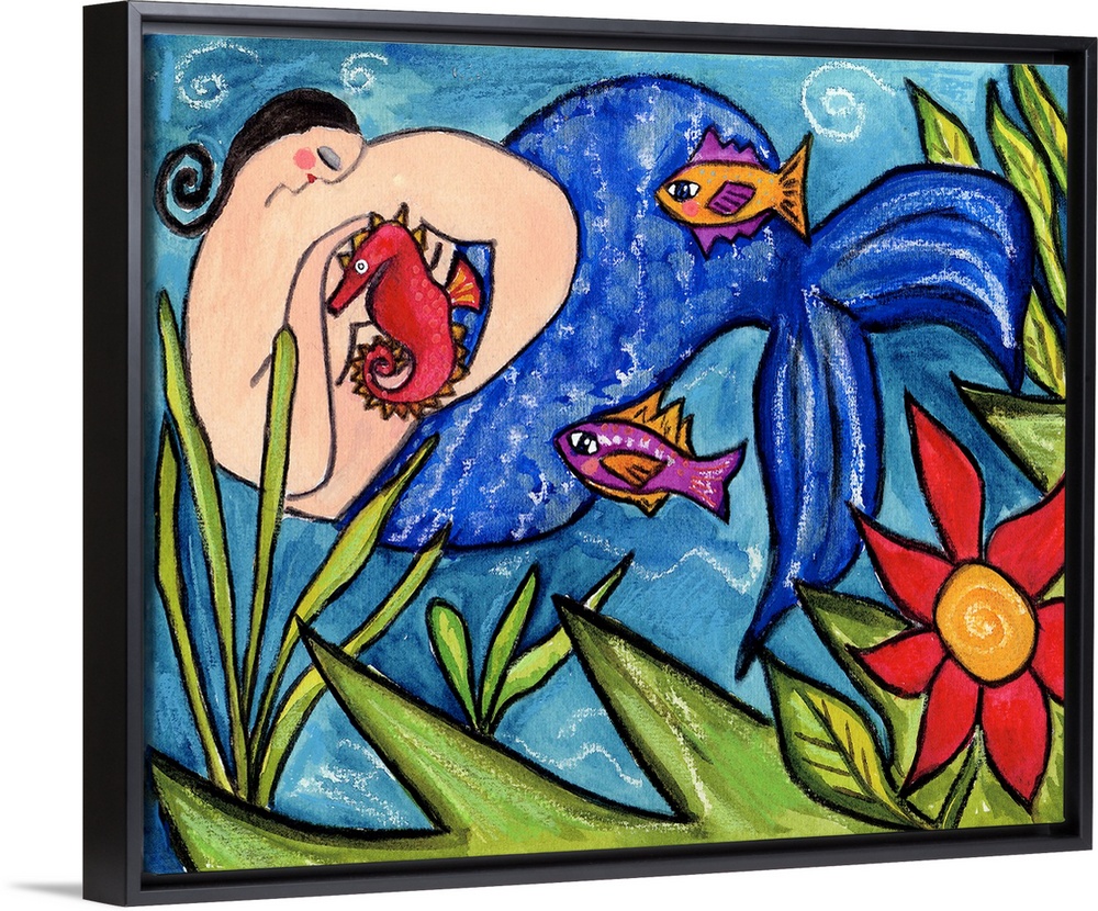 <p>A mermaid with a blue tail holding a sea horse underwater.</p>