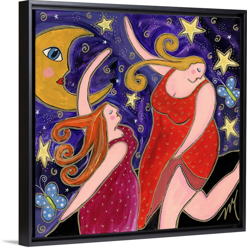 <p>Two women in red dresses dancing under the crescent moon.</p>
