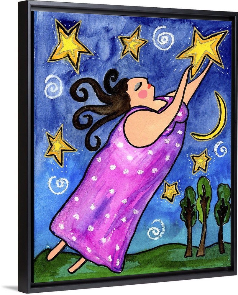 <p>A woman in pink raising her arms toward the stars in the sky.</p>