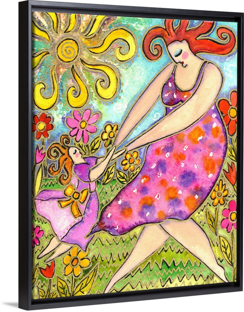 <p>A woman in a pink dress dancing with her daughter in a garden.</p>