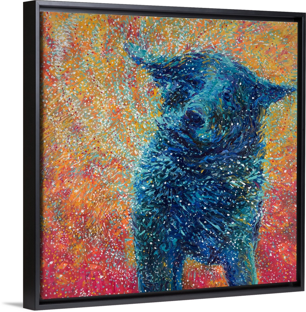 <p>Brightly colored contemporary artwork of a big dog shaking off water.</p>