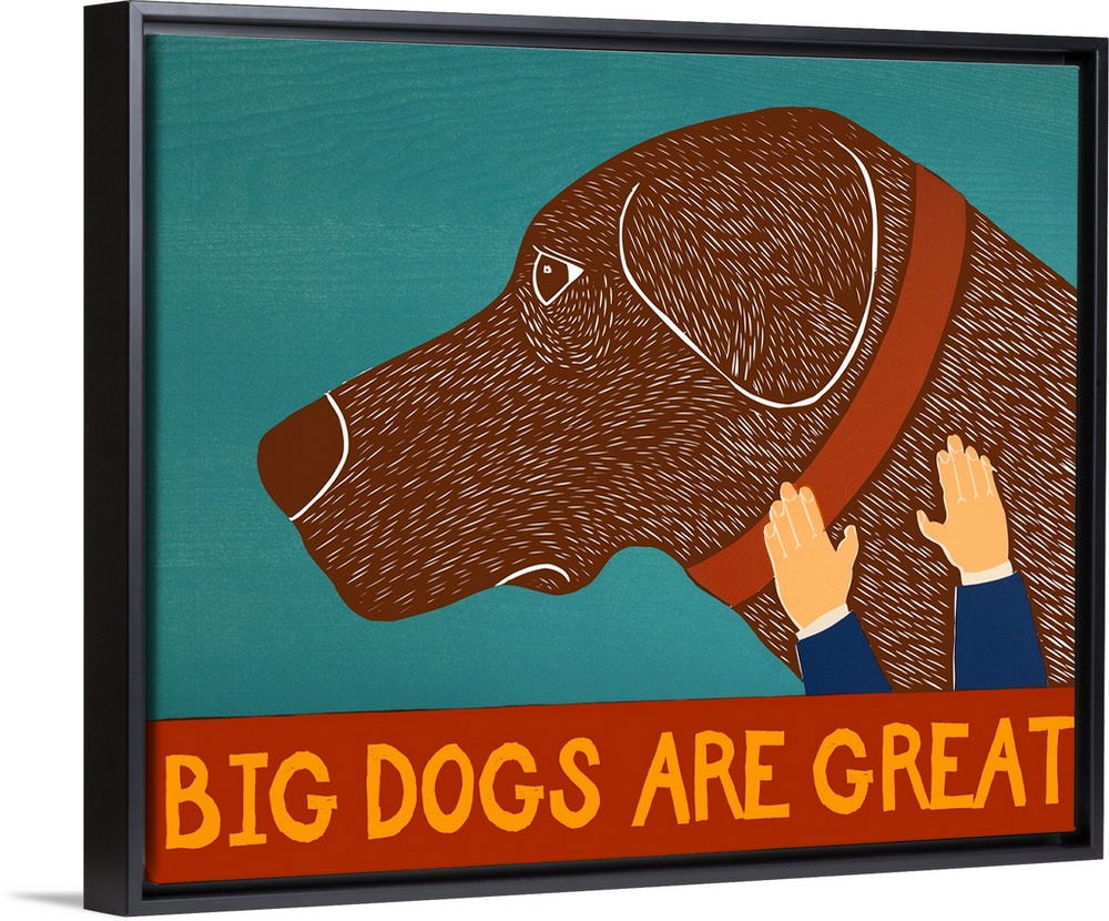<p>Illustration of a chocolate lab being petted with the phrase "Big Dogs Are Great" written on the bottom.</p>