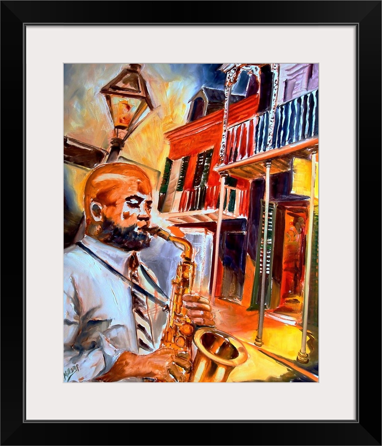<p>Big painting on canvas of a man playing a saxophone with colorful buildings behind him.</p>