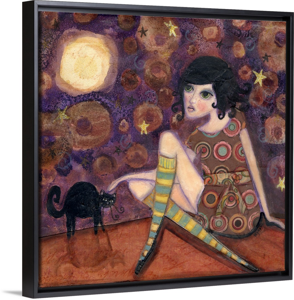<p>Painting of a girl in a patterned dress petting a black cat under a full moon.</p>