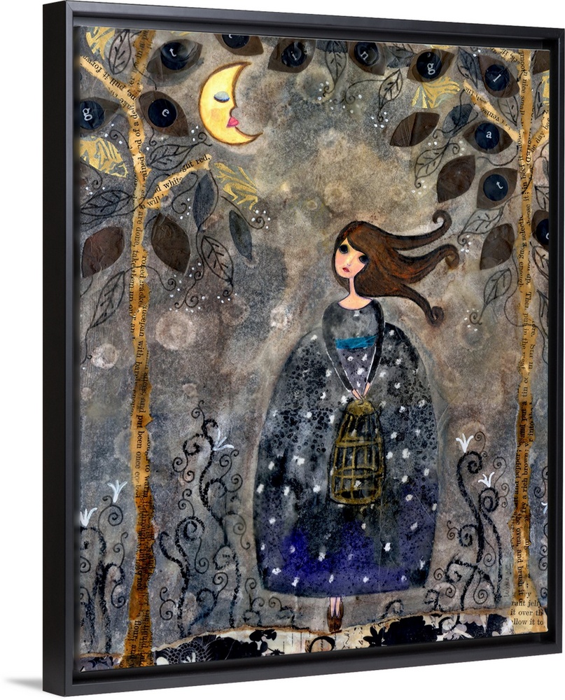 <p>A girl in a dark dotted dress in a forest under the moon.</p>
