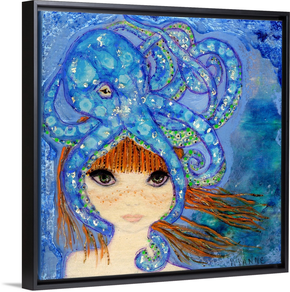 <p>Painting of a girl with large eyes with a big blue octopus on her head.</p>