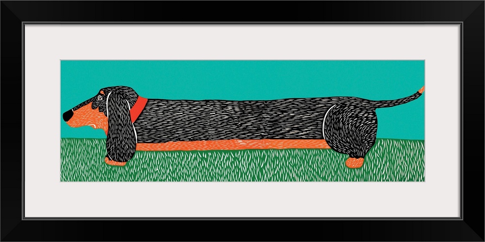 <p>Illustrated portrait of a long dachshund outside on the grass.</p>