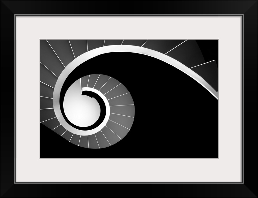 <p>High contrast black and white image of a spiral staircase.</p>