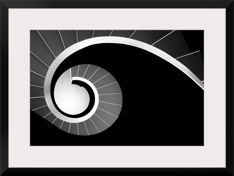 <p>High contrast black and white image of a spiral staircase.</p>